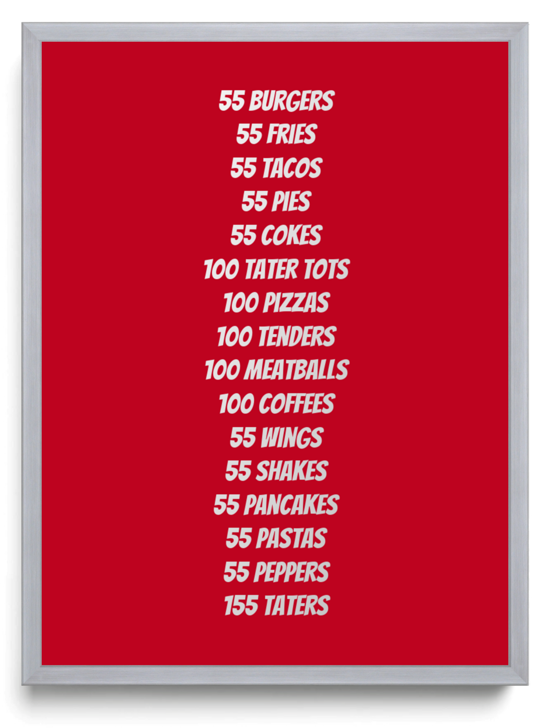 55 burgers 55 fries 55 tacos 55 pies 55 cokes 100 tater tots 100 pizzas 100 tenders 100 meatballs 100 coffees 55 wings 55 shakes 55 pancakes 55 pastas 55 peppers 155 taters