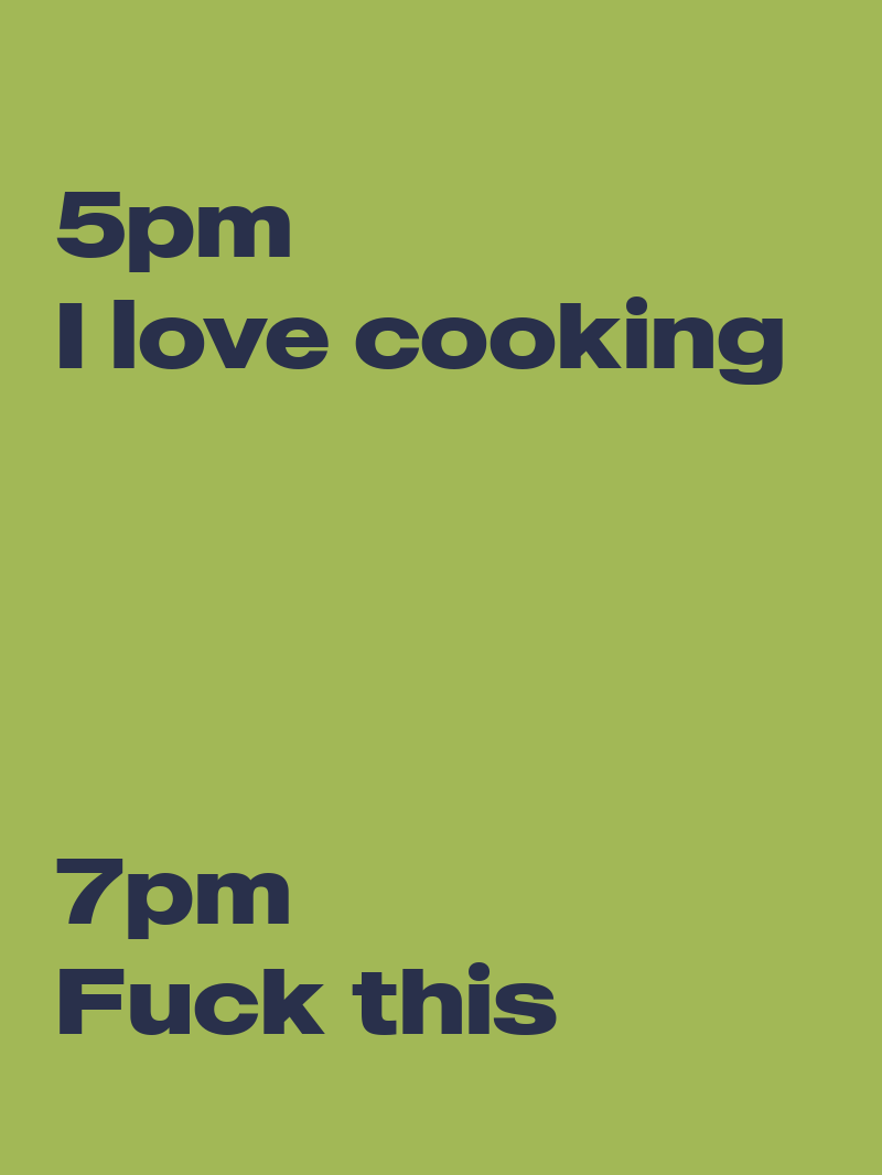 5pm I love cooking, 7pm Fuck this
